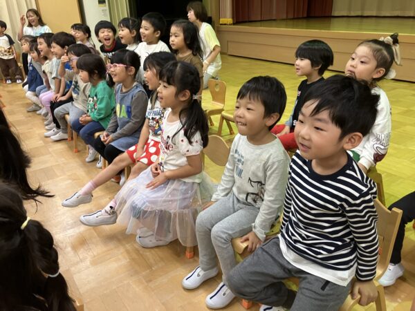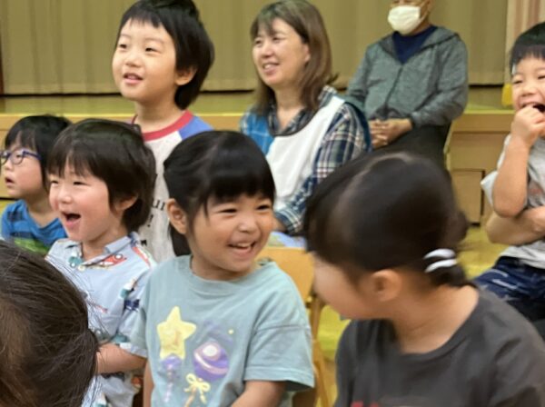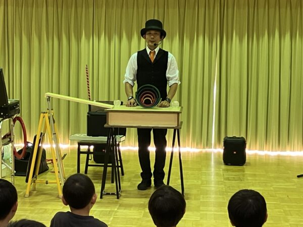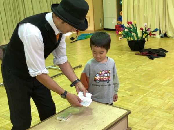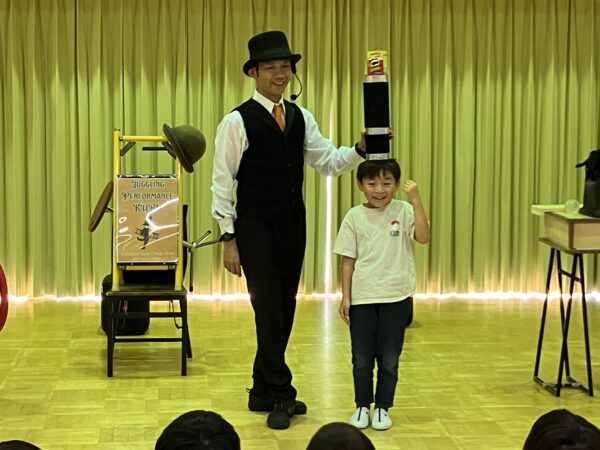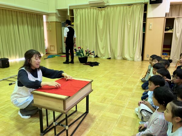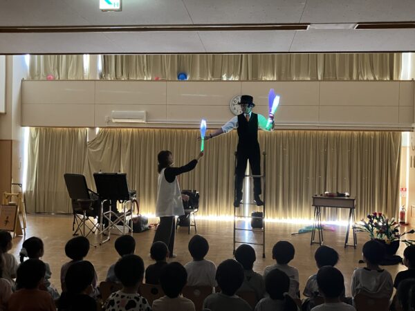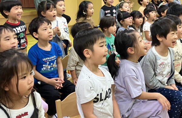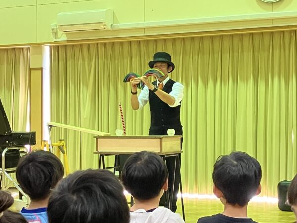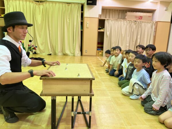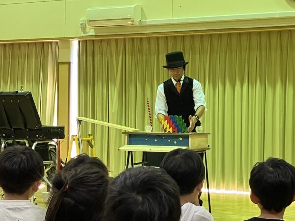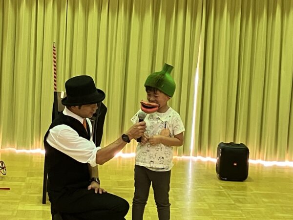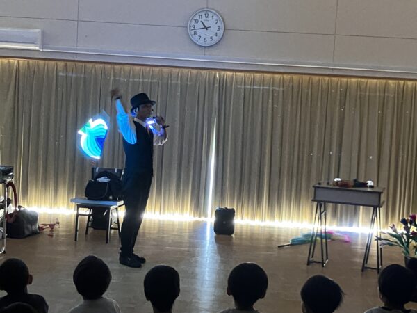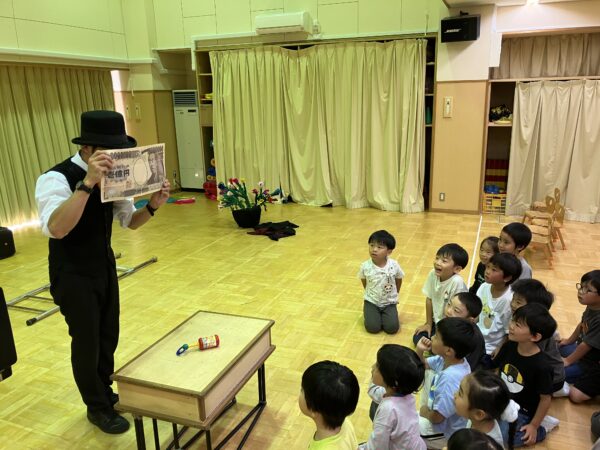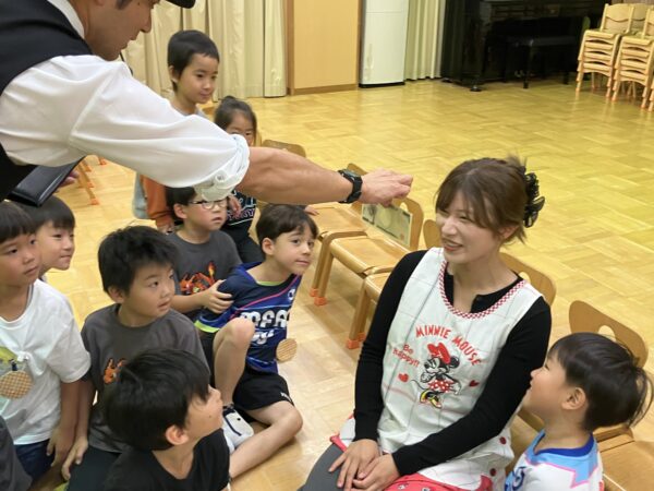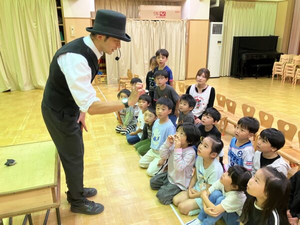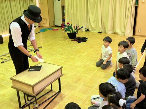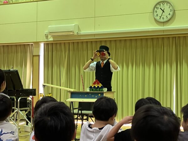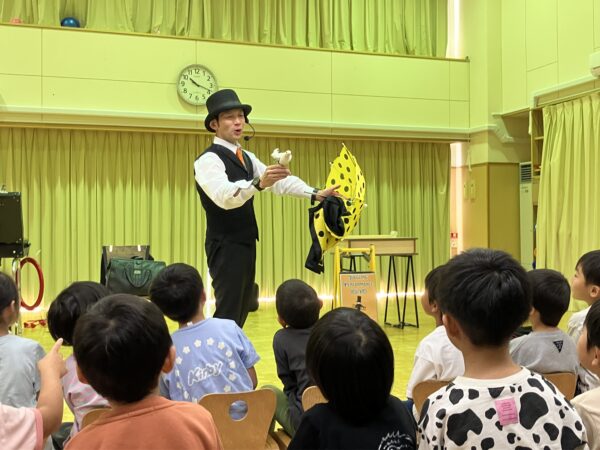 今日は子どもたちが楽しみに待っていたクロさんによるマジックショーでした。『クロさーん!!』と呼ぶ声と共に登場し、たくさんのマジックやショーを見せてくれました!