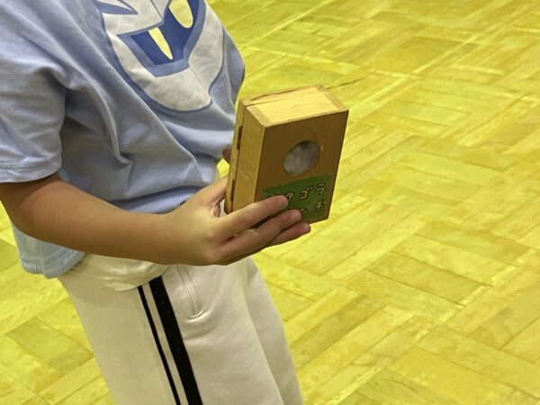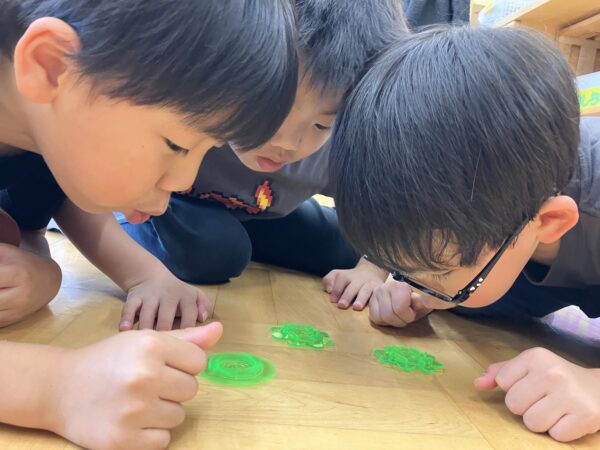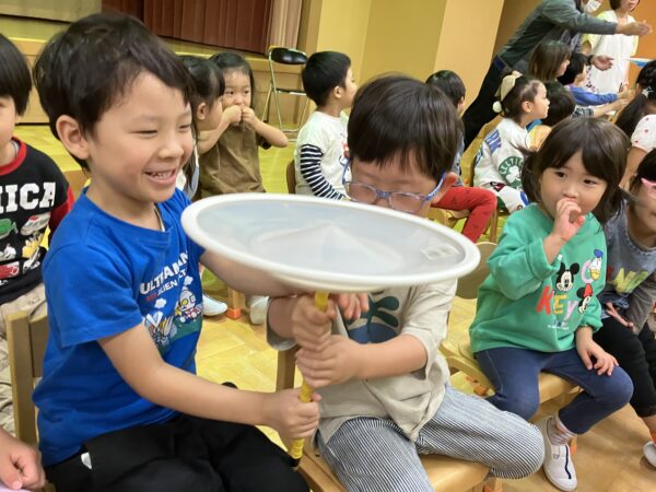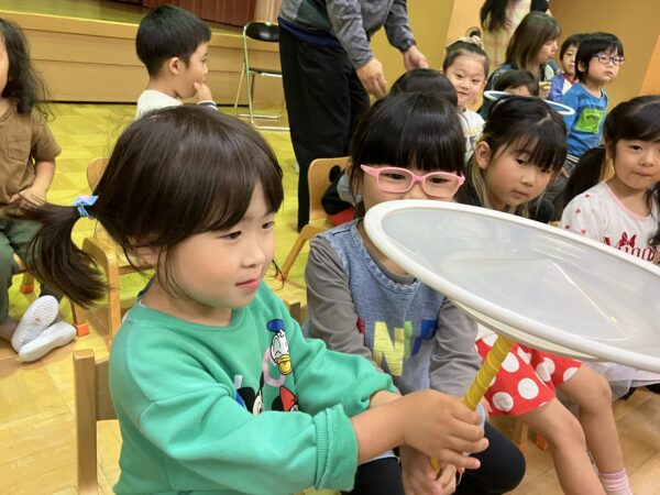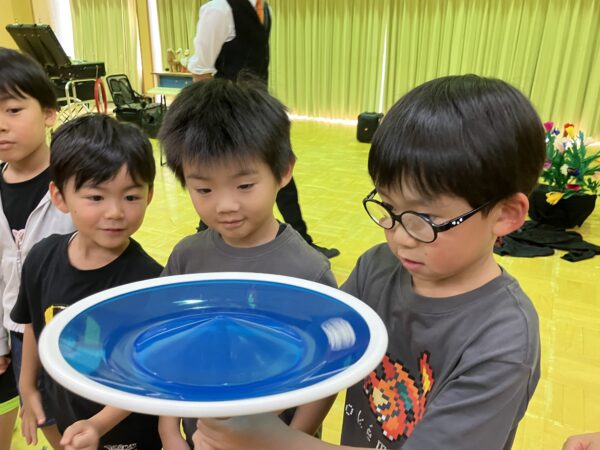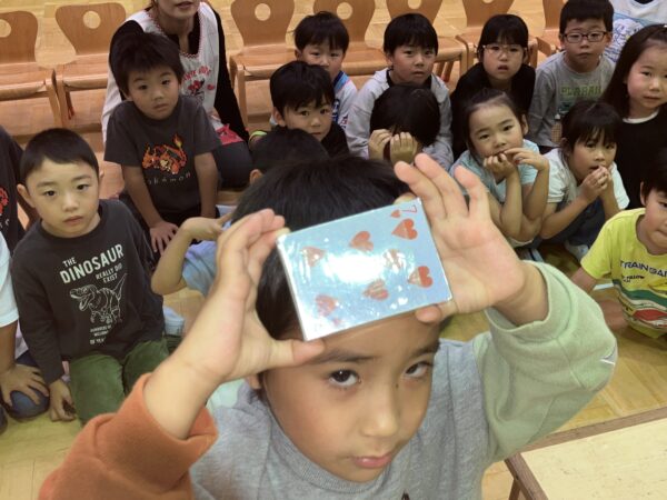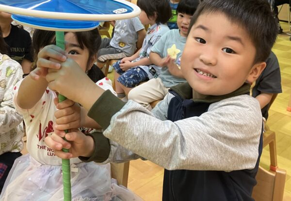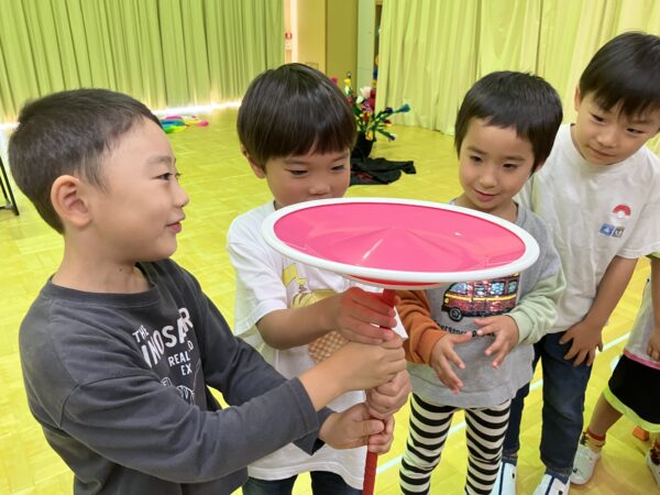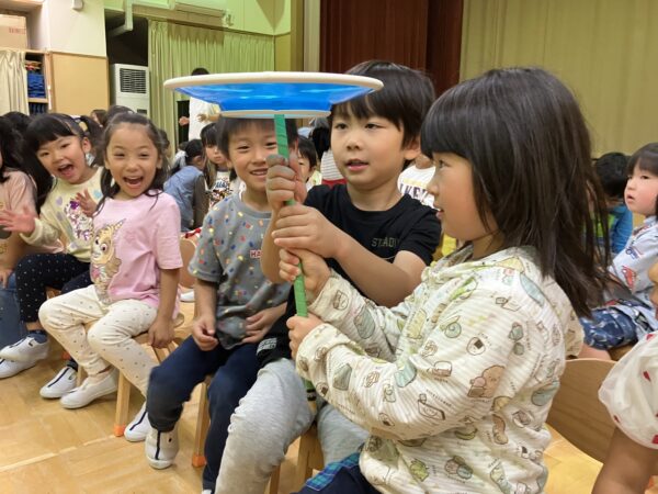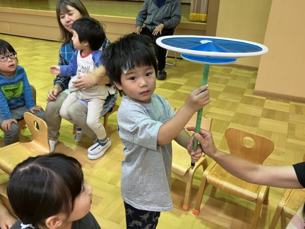 クロさんから幼稚園のみんなにコマのプレゼントをいただきました。うまく回すコツは、コマの真ん中に強く息を吹きかけることだそうです!持ち帰りましたので、ご家庭でも遊んでみてくださいね☆