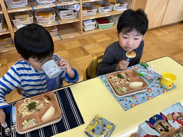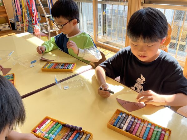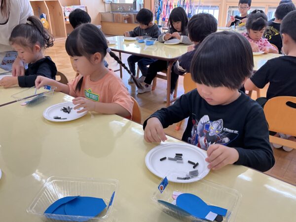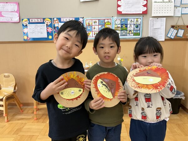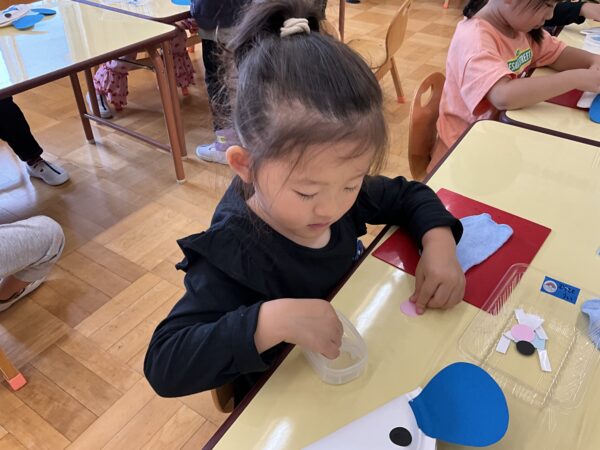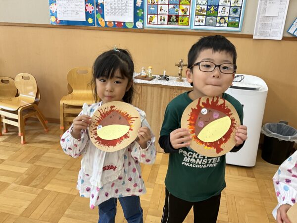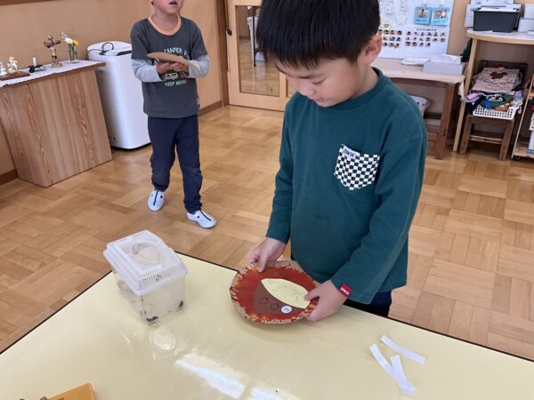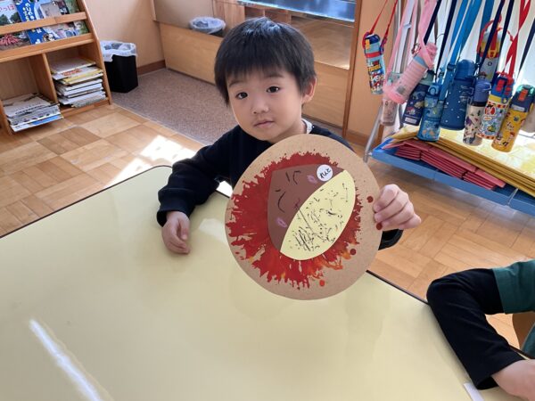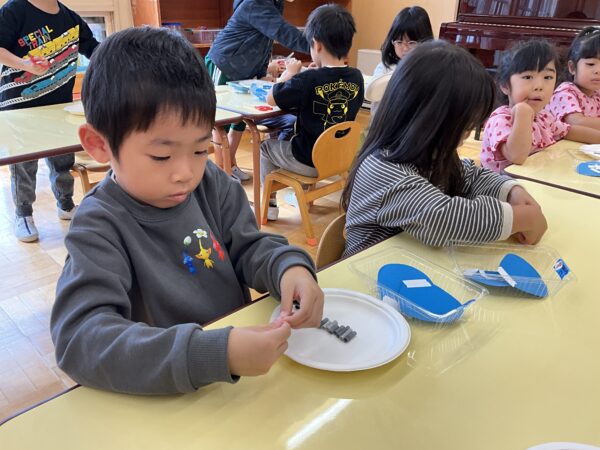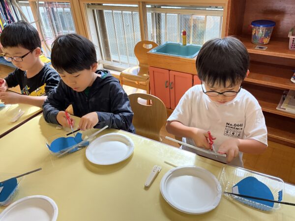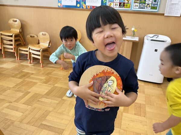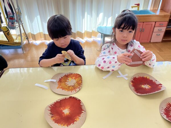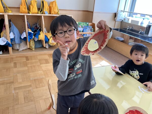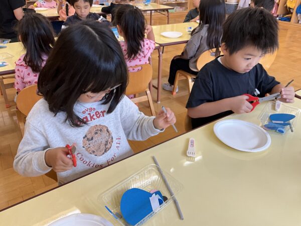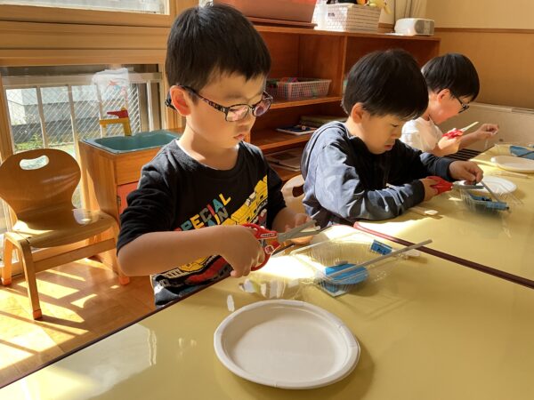 クラスで1年を通して音楽に関する活動を行っています♬今回はタンバリンを作りました。年長さんは紙皿の中に入れるストローも自分たちで切ってもらいました!紙皿の中で鳴るストローの音に耳を傾けていました。参観日では「♪手を叩きましょう」で演奏も聴いてもらうことが出来て良かったと思います♡実は、「雨が降ったら雨音の実験もしたいね」とみんなで話し合っているのですが、クラスの時間でなかなか雨が降っている時間に当たらず、雪が降る前に実験できることを願っているぞう組です!