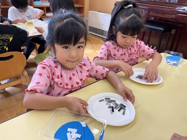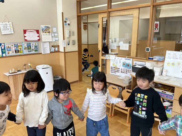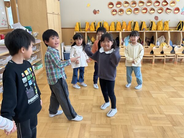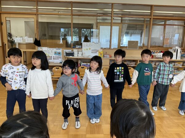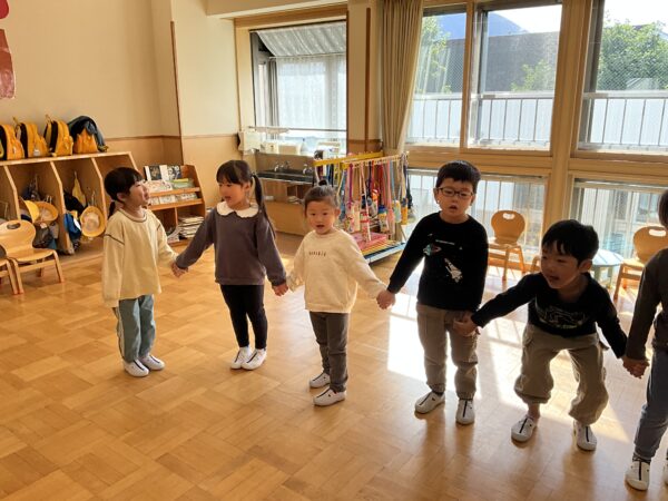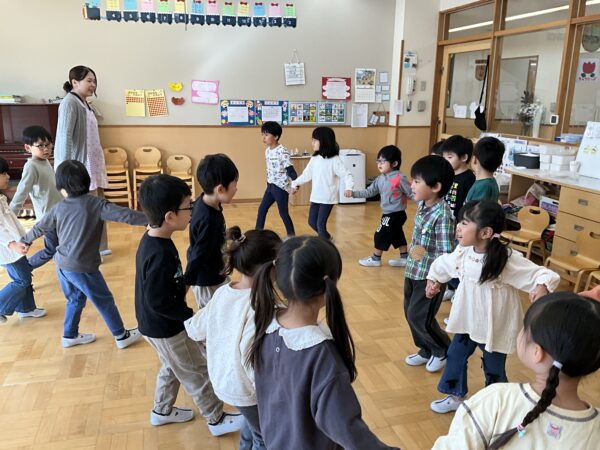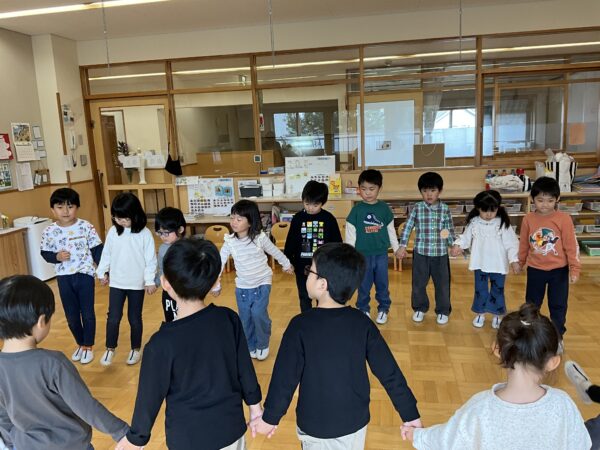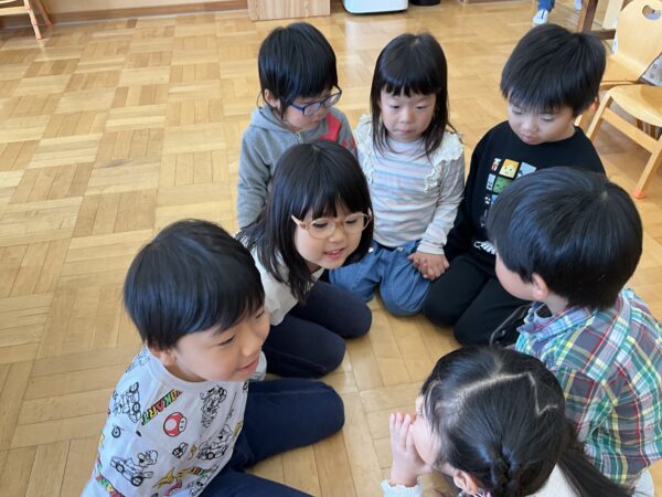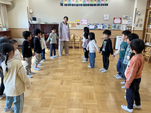 花いちもんめというわらべ歌で遊びました。じゃんけんや誰をもらいたいかという話し合いなど少し難しい場面もありましたが、相手の意見に耳を傾け楽しみながら行うことが出来ました!また機会を見て行えたらと思っています♬