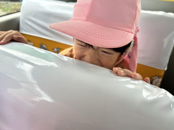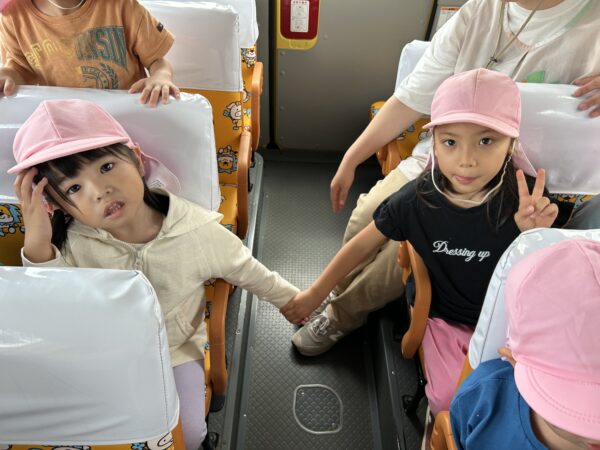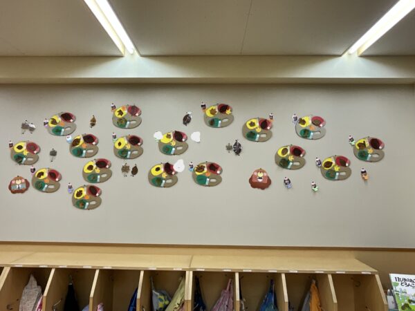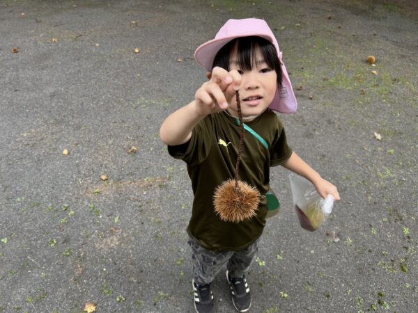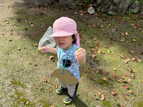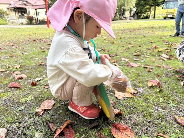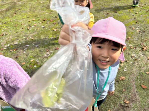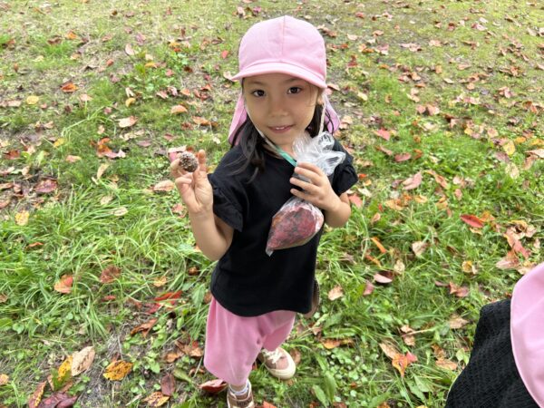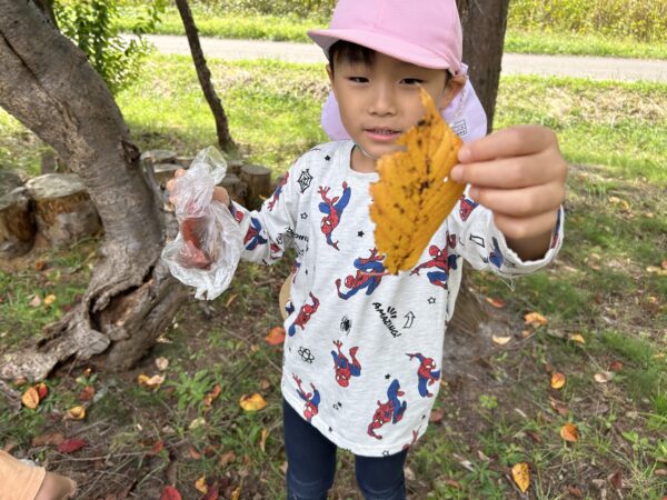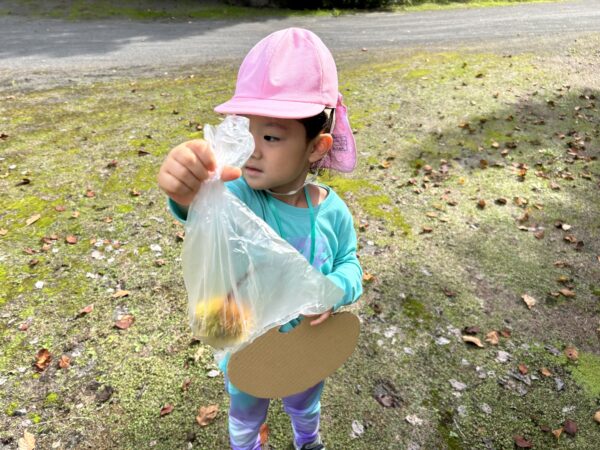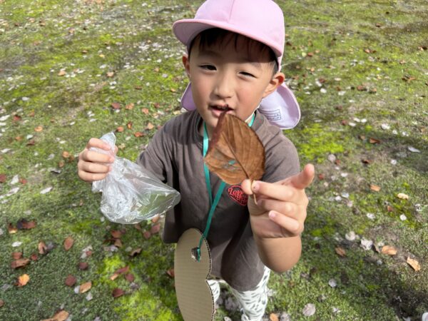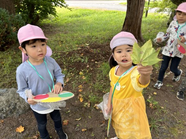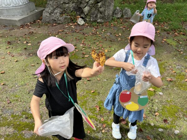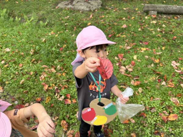 うさぎ組では、秋になったら葉っぱの色が変わるのを知ってる?という話をしました。すると子どもたちから、「赤とか黄色になるでしょ!」と言う声があがってきました。そこで、「素敵なパレットを作ったから同じ色を探しに行かない?」と子どもたちに提案しました。行きたい!と言う声が上がったので、みんなで秋の葉っぱ探しに出かけることにしました!バスに乗って金毘羅寺に行きました。お寺につくとすぐにあった!と嬉しそうに見つけ、袋からあふれそうなほどたくさん集めているお友だちもいました♪秋ならではの大きな栗もありました!