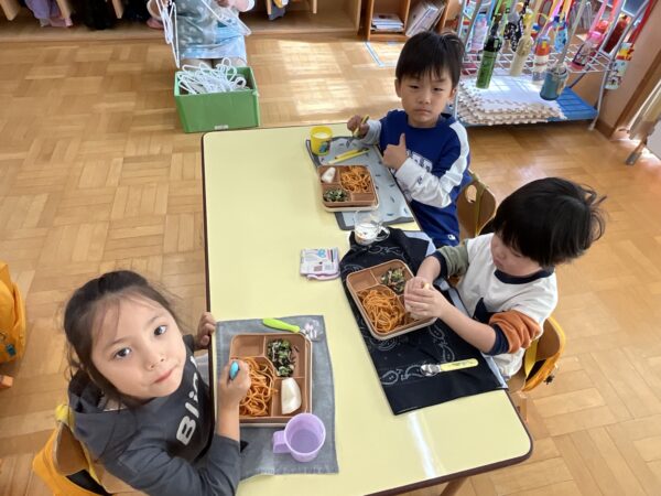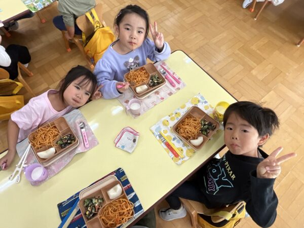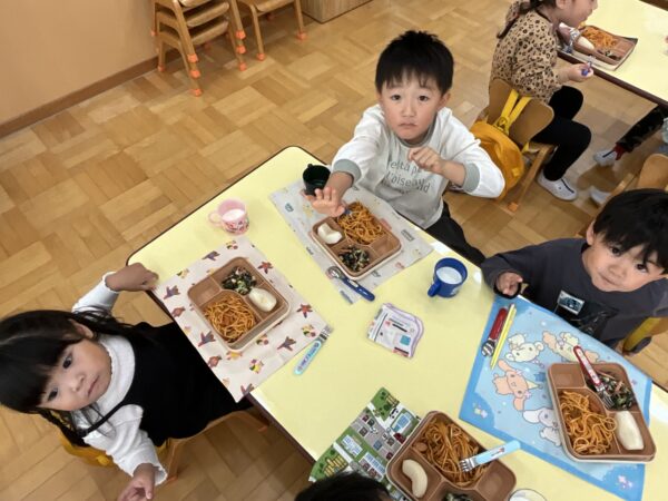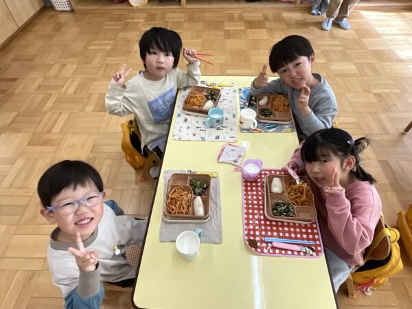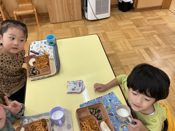 今日の給食はなにかな?といつも楽しみにしている子どもたちです♪この日の給食はナポリタンでした。口の周りが美味しそうな色になっている子がたくさんいて、お友だち同士で「赤いおひげが出来ているよ!」と言い楽しそうでした!また、牛乳の日だったので白いおひげが出来ているお友だちもいて可愛らしかったです♡