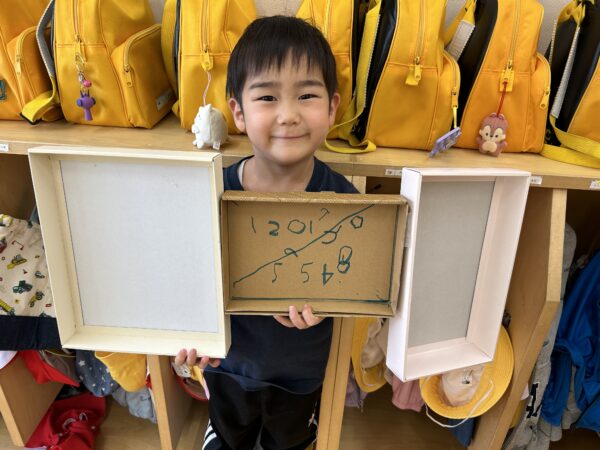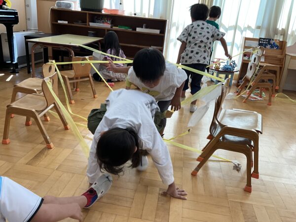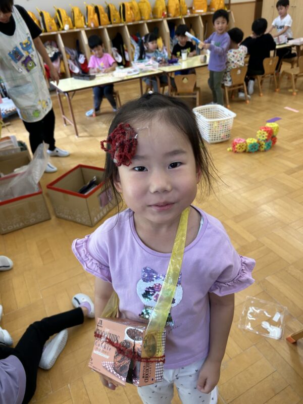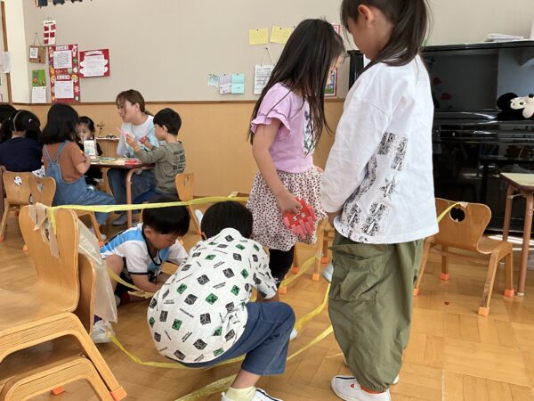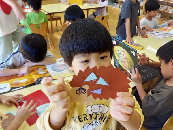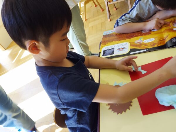 先日のクラス参観の日に、はりねずみの製作をしました。はりねずみの体にクレヨンで模様を描いたり、のりで飾りを付けたりしました。クレヨンだけで模様を描く子や模様を工夫して貼る子、色々な色の飾りを貼る子など様々でした☆そして、次のぱんださんでの活動の時にはりねずみと葉っぱをたこ糸にセロハンテープで貼って完成です‼葉っぱの数は何個でも良かったので、たくさんつけるお友だちも♪