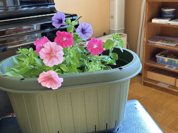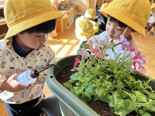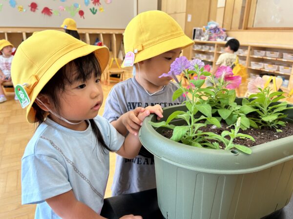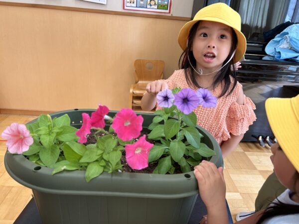 小さい種をそっと植えたペチュニアが、2学期になりどんどん大きな花を咲かせてくれました☆その日のお当番さんが水やりをしてくれて、咲いたペチュニアが色々な色が咲いたことを喜んでいるぱんだぐみさん。咲いたペチュニアを使って色水実験をしたり、紙に挟んで上から叩いてみてお花のスタンプをしたりしています!子ども達と「次は何をする?」と相談しながらのペチュニア育ては、「お家の人に見せたいな♪」ということで、毎日押し花を作りためています☆みんなの分がだいぶ集まったので持ち帰れるようにする予定です♡