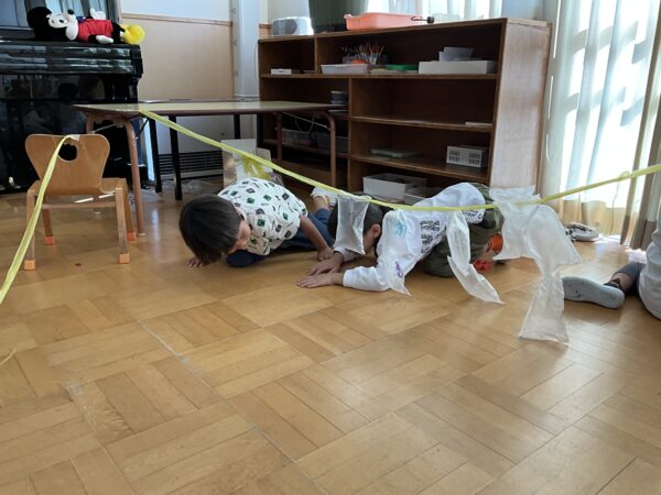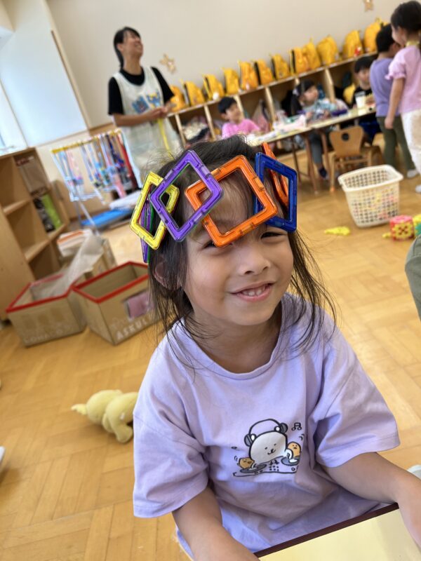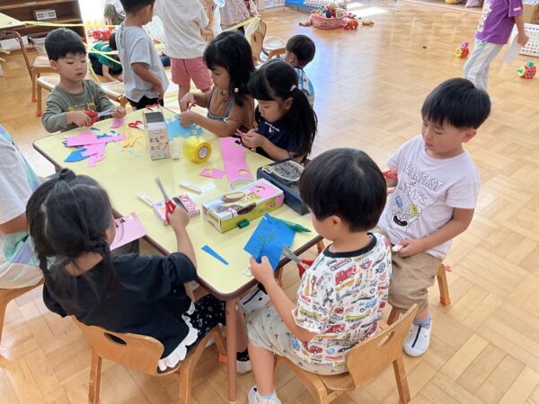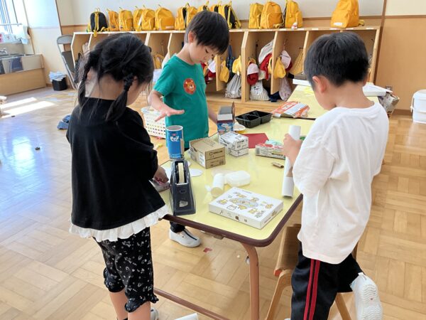 ぱんだぐみさんと言えば…やっぱり廃材遊び!朝から、「今日はぱんださんの日?」「廃材遊びできる?」と聞いてきてくれる子どもたち。「ご飯の後しよう♪」と言うと「やった~‼」と喜んでくれています♡廃材遊びスタートした当初は、小さい作品が多かったのですが、最近は何日もかけて作り続けるお友だちも増えて来ました♬はさみを使って切って貼って作り上げる子、袋に顔を描いたおばけを使って「おばけ屋敷~!」「おばけにぶつからないように通ろう」などとみんなで遊ぶ子、レジやお金を作ってお店屋さんをする予定の子などそれぞれ楽しく過ごしていますよ♡また、廃材遊びに満足したお友だちは、引き続きブロック遊びなども楽しんでいます♪
