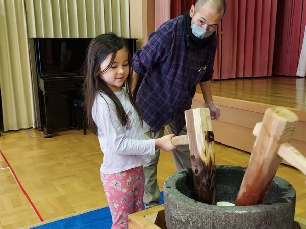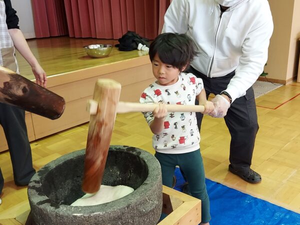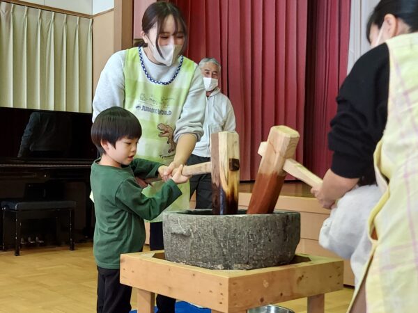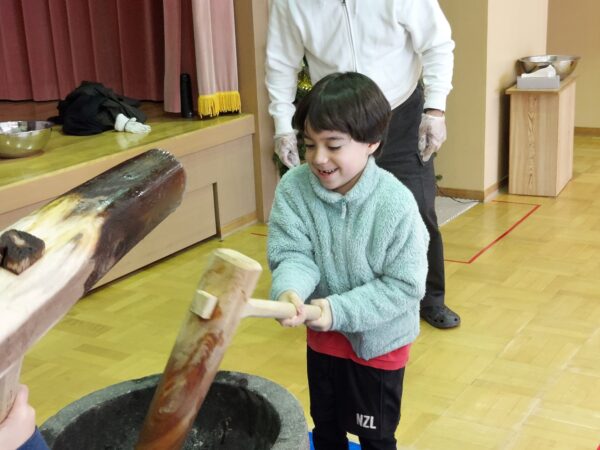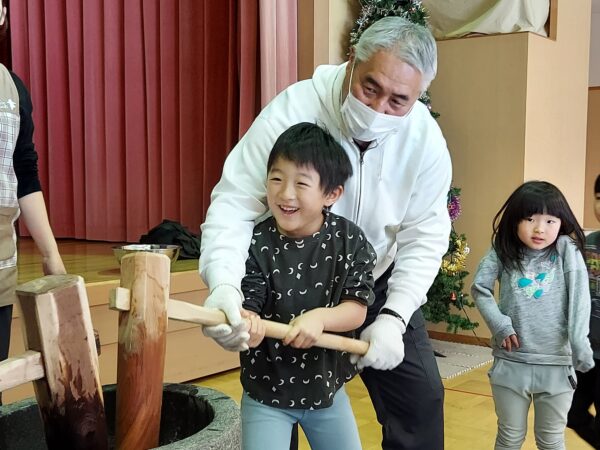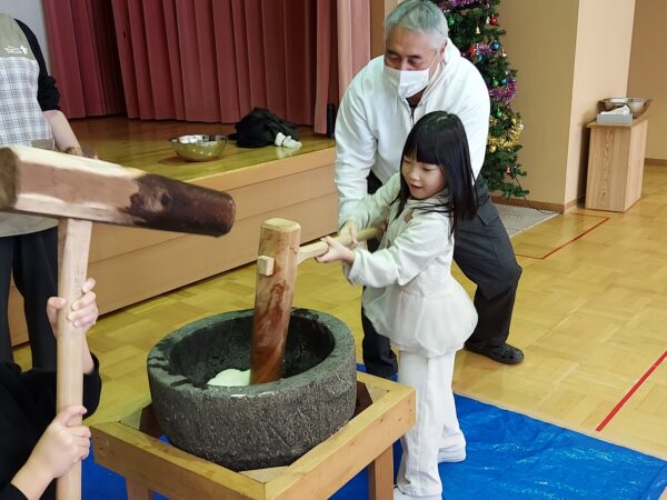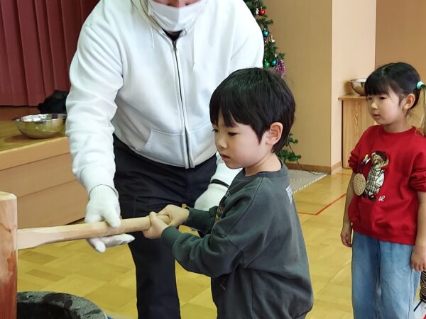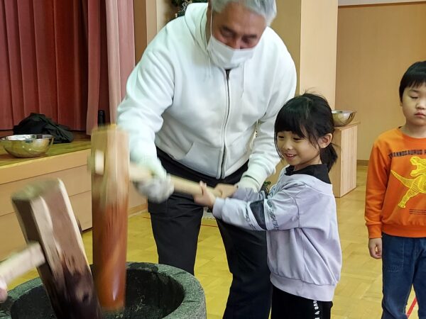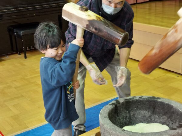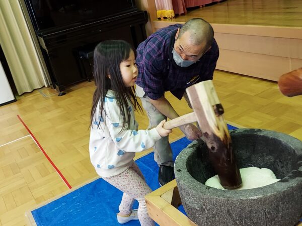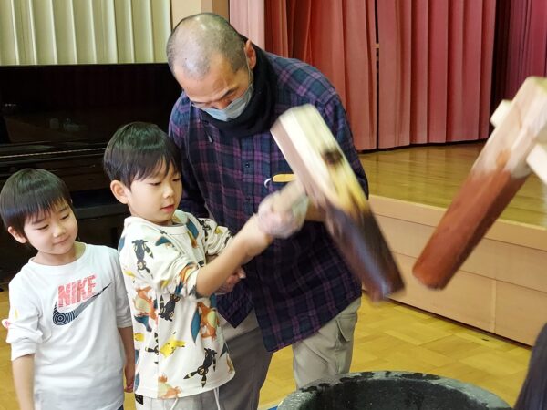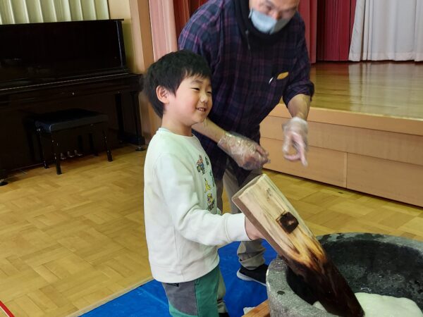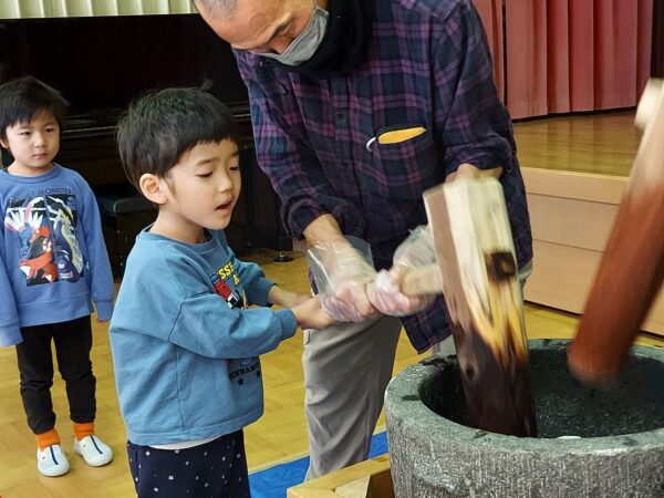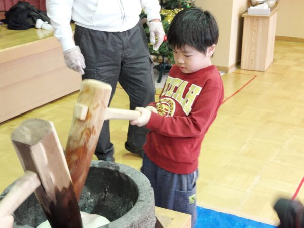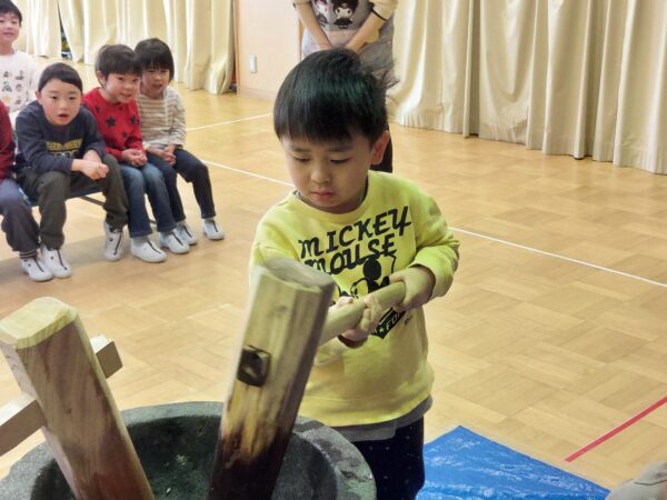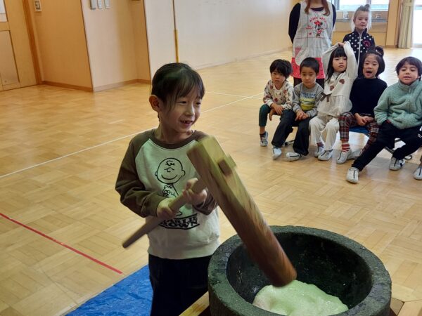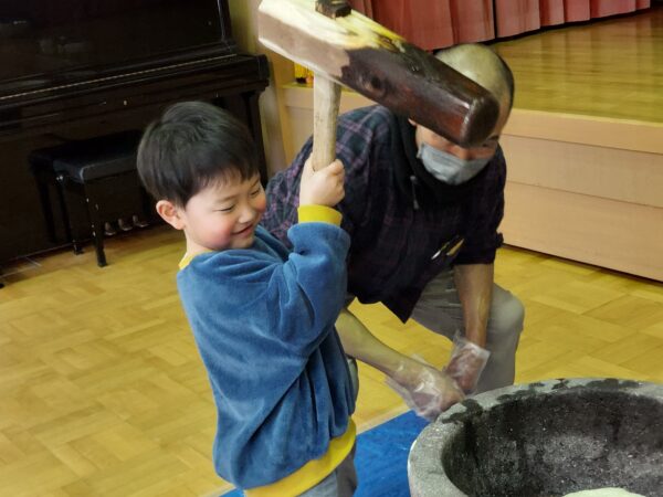 最後は年長さんがおもちつきをしました♪幼稚園で一番大きい年長さんは、一人で杵を持ち、おもちをつきましたよ!さすが年長さん、とっても力強かったです♪