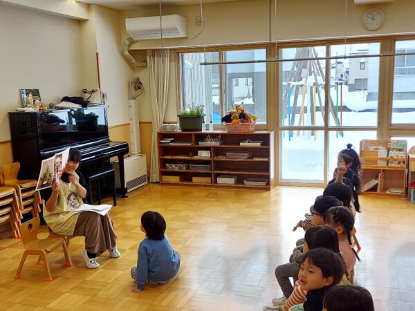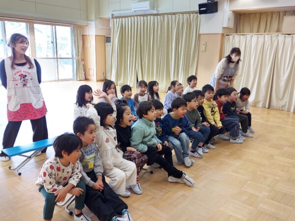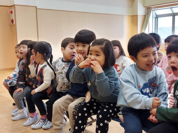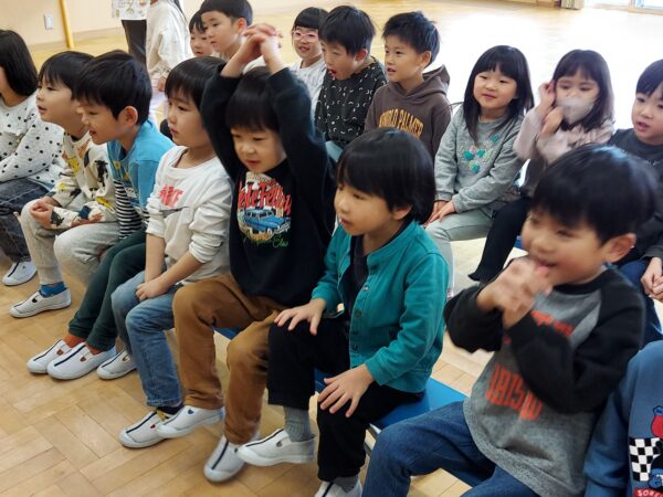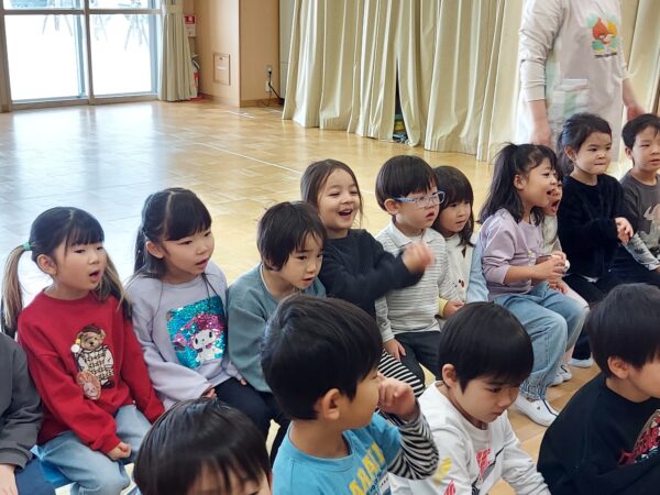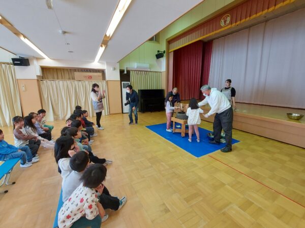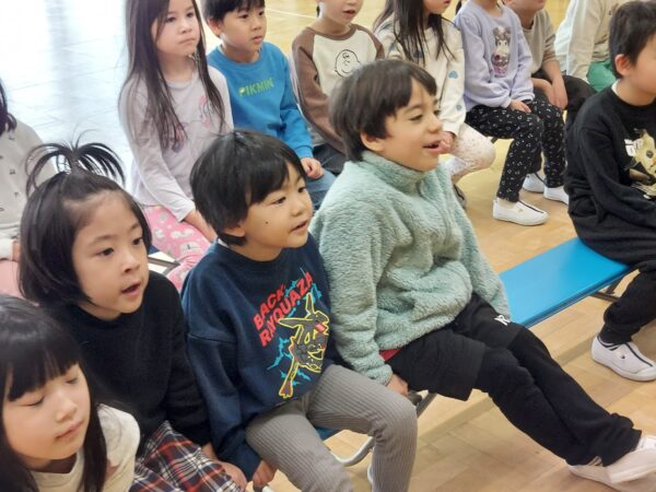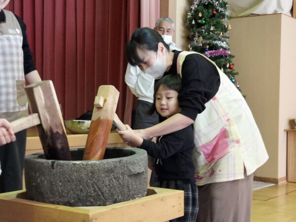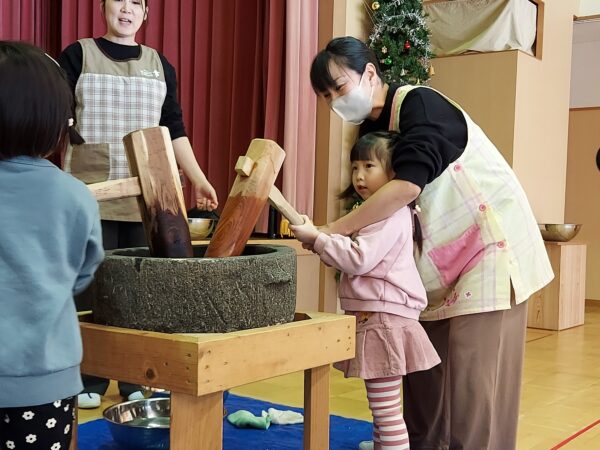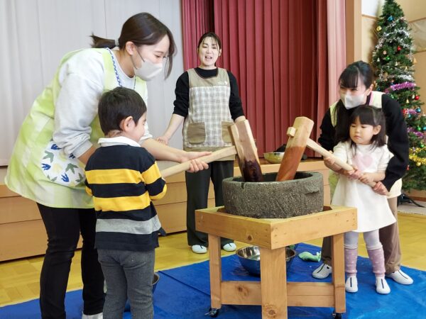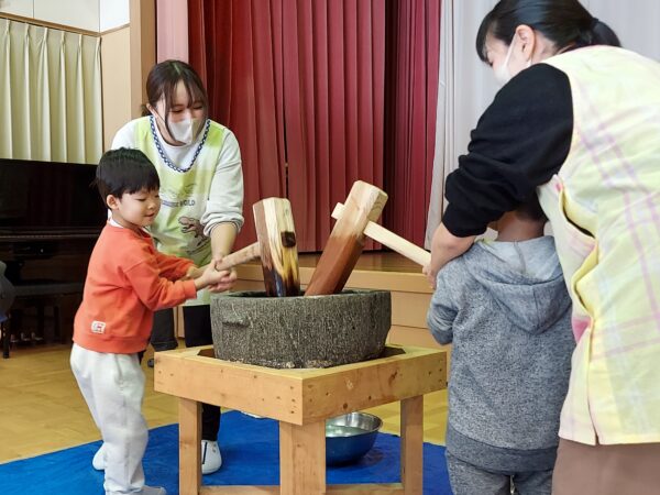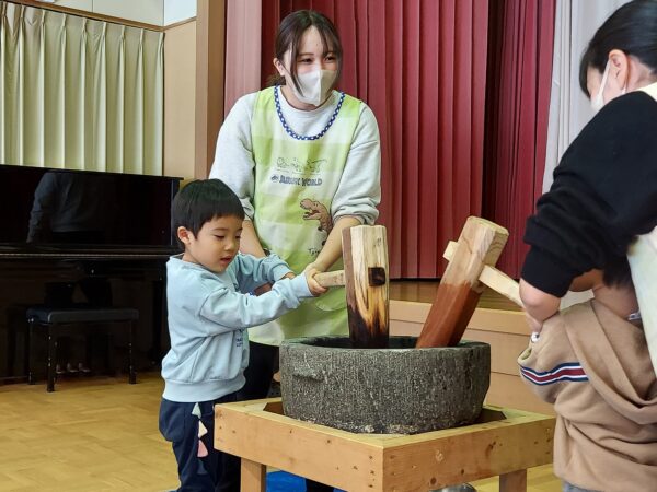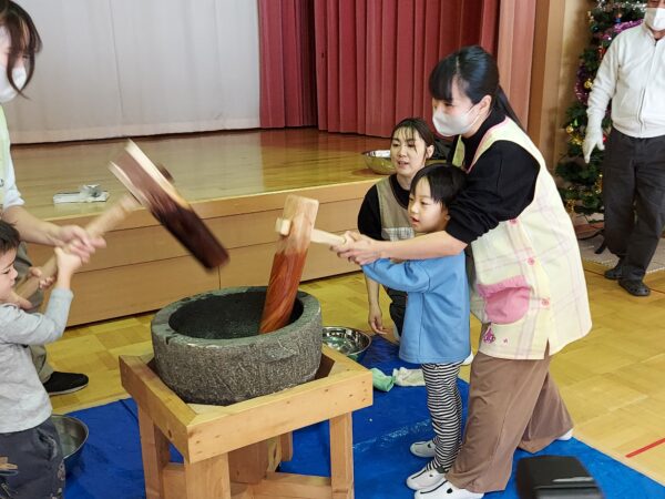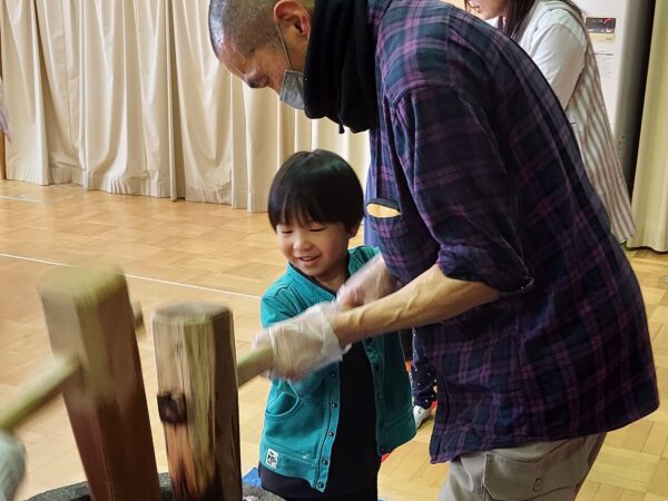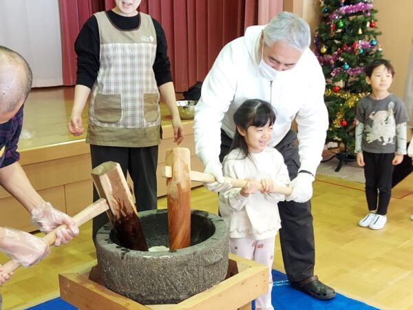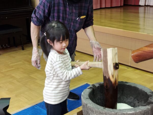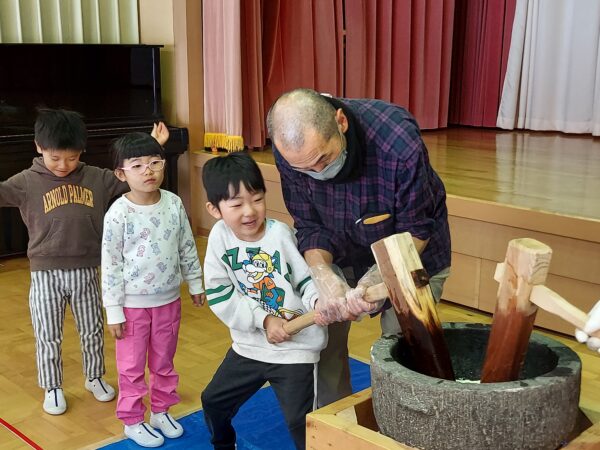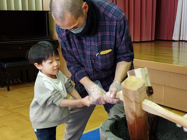 最後は年長さんがおもちつきをしました♪幼稚園で一番大きい年長さんは、一人で杵を持ち、おもちをつきましたよ!さすが年長さん、とっても力強かったです♪