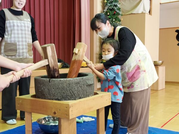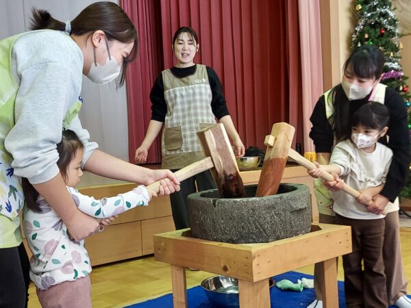 そして学年ごとにおもちつき開始!まずは満3歳さんと年少さんが行いました。重たい杵を、先生やお友だちと力を合わせて持ち、一生懸命頑張りました!