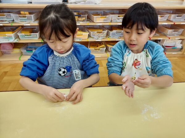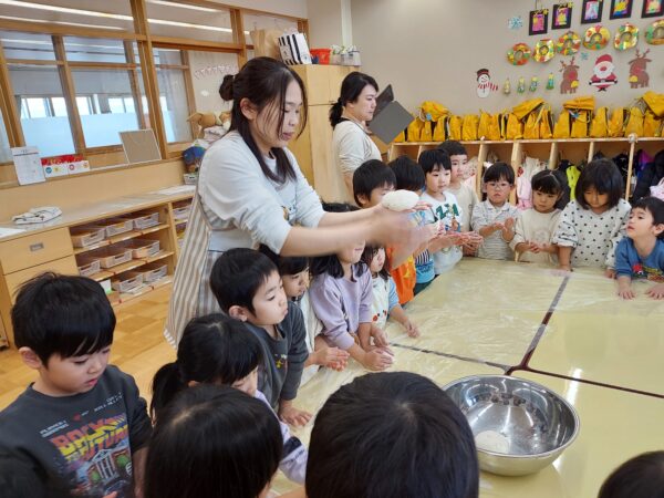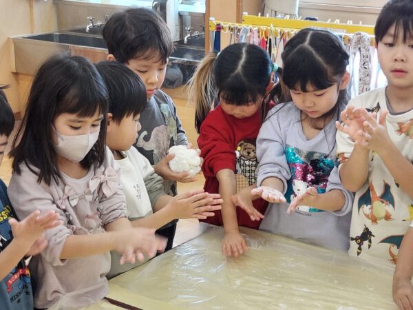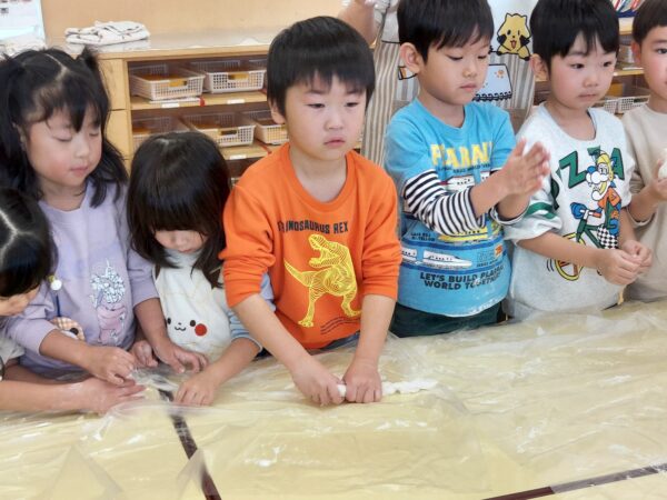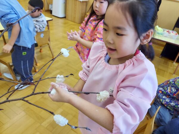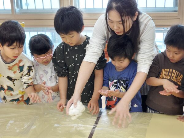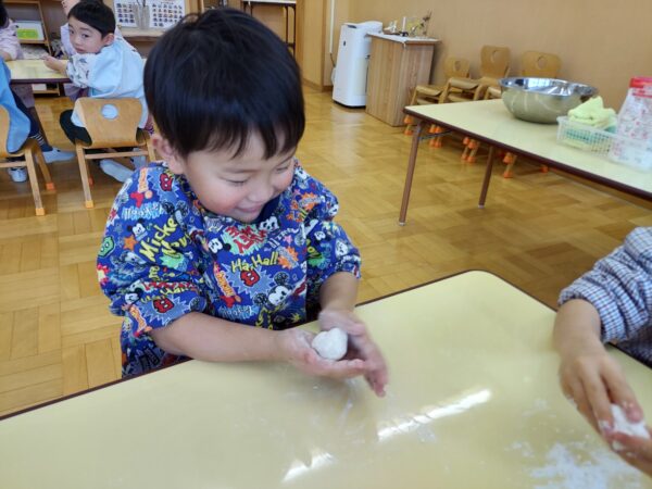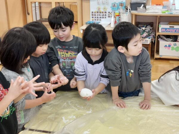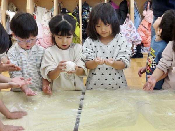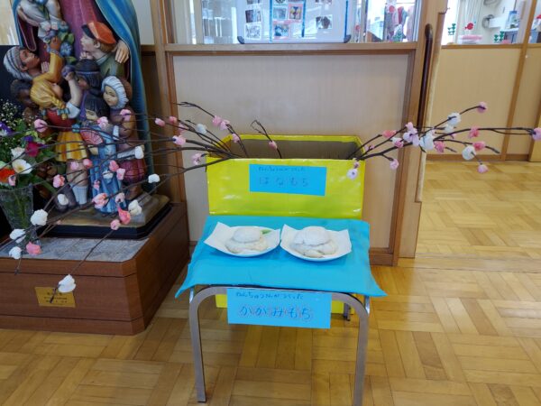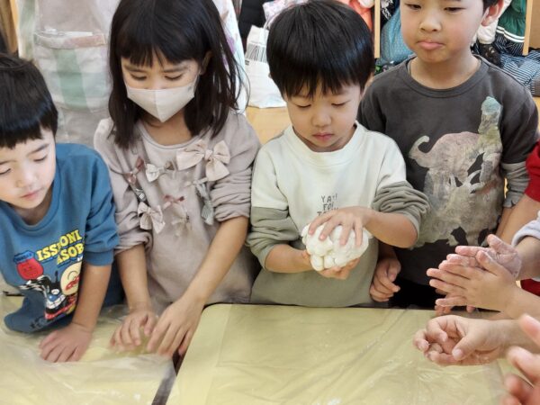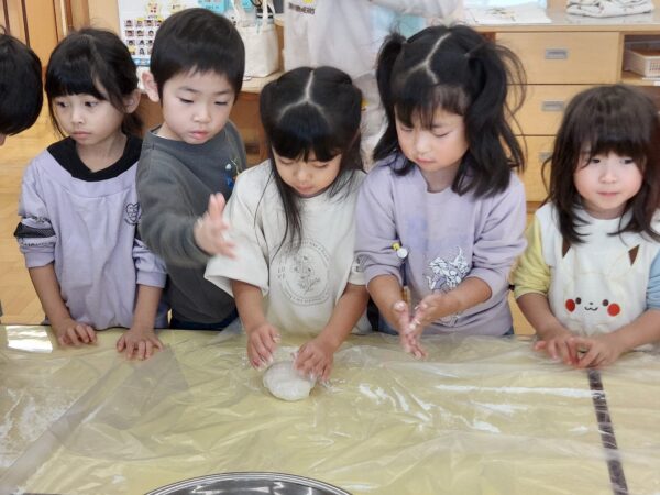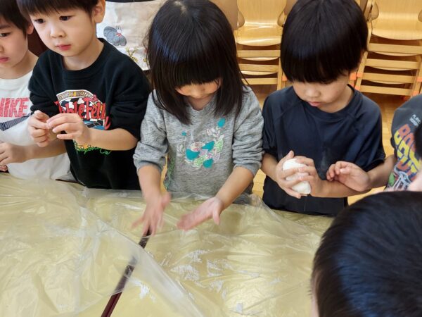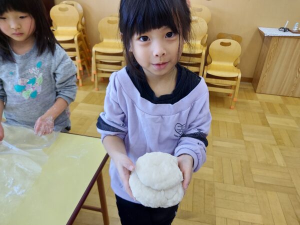 みんなで協力してついたおもちは、年中さんが鏡もちに、年長さんが花もちにしてくれましたよ!