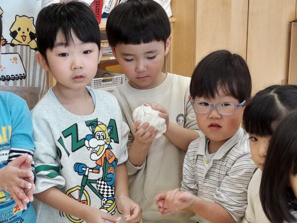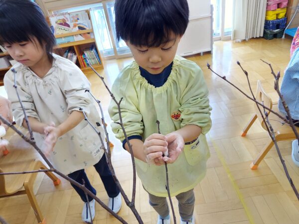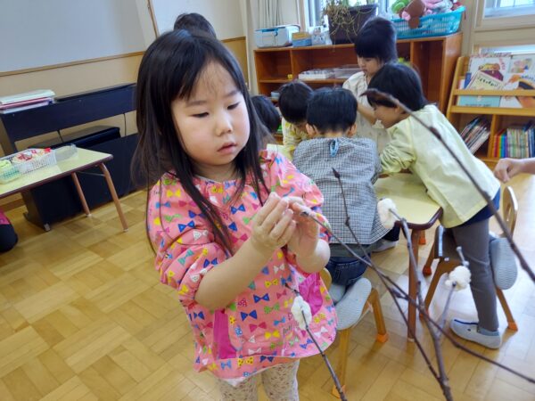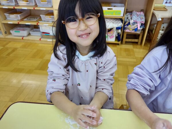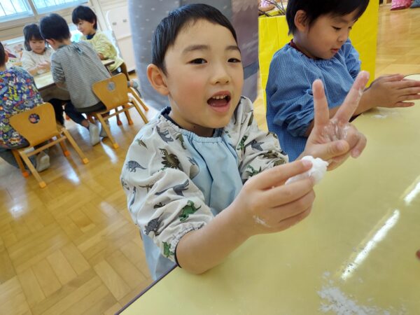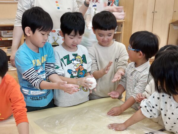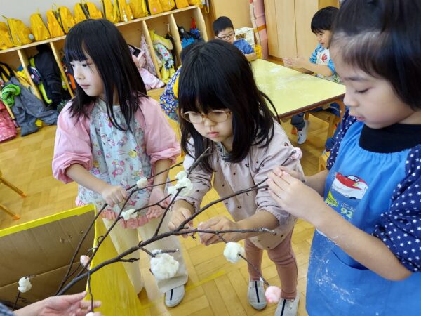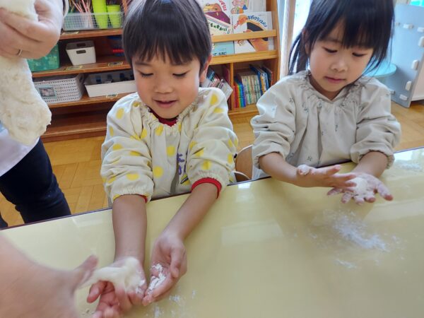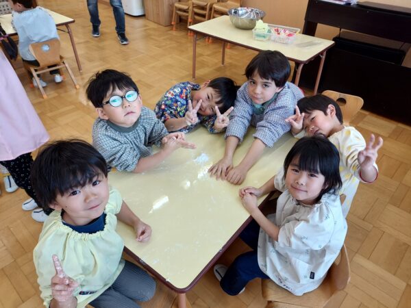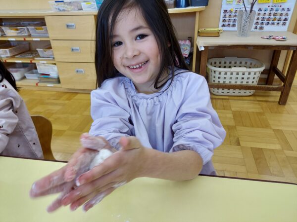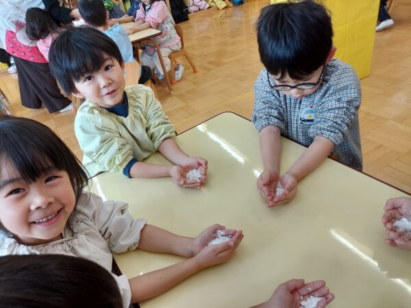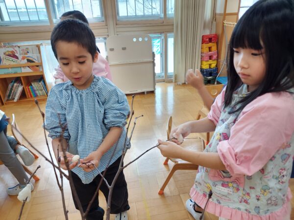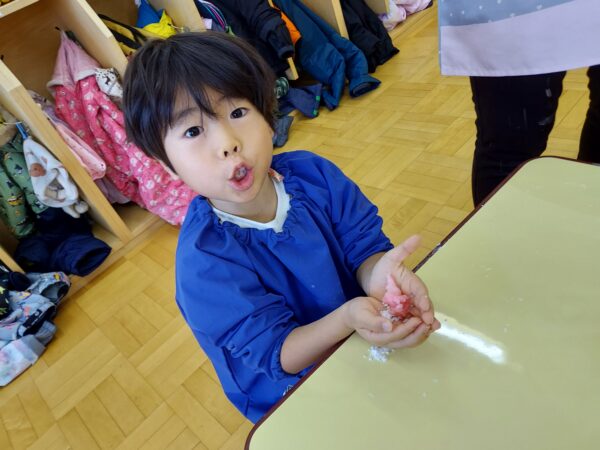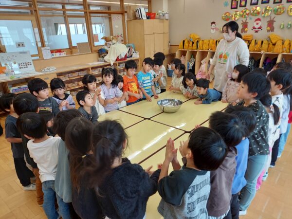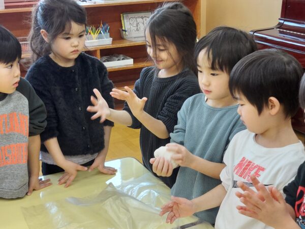 みんなで協力してついたおもちは、年中さんが鏡もちに、年長さんが花もちにしてくれましたよ!