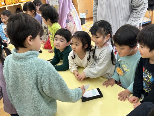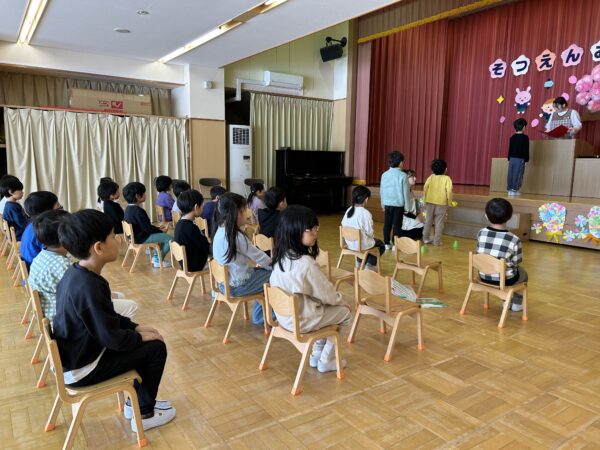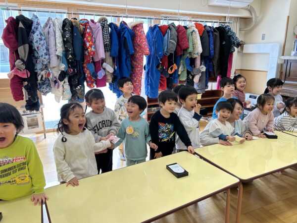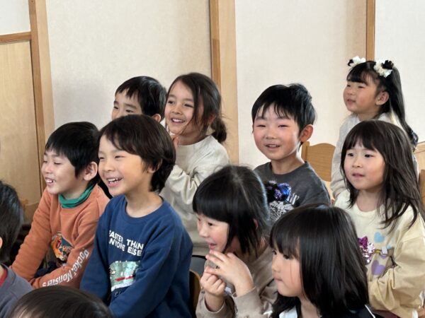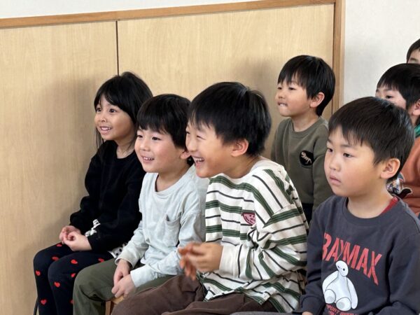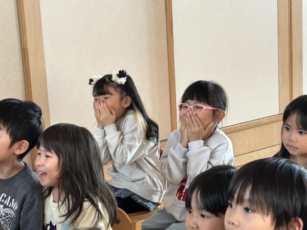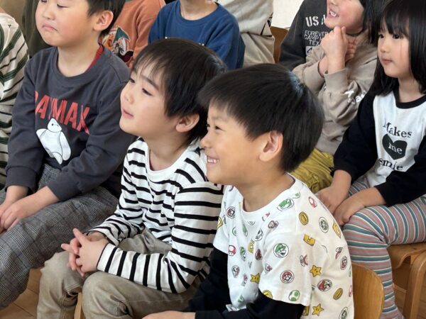年長さんが卒園式の練習をしている間、こそこそと楽しそうな活動をしている満3歳・年少・年中の子どもたち♡実は、明日のお別れ会に向けて、年長さんに内緒で『映画作り』をしていたのですが、その試写会が行われていました!詳細は明日までの秘密ですが・・・子どもたちの表情をみていると、楽しさが伝わってきましたよ☆