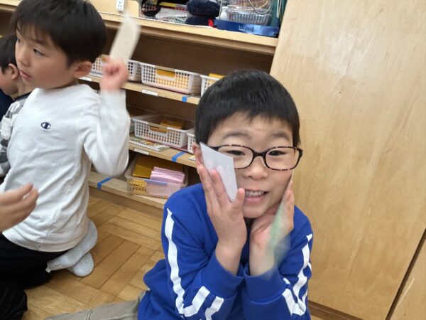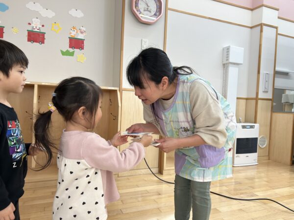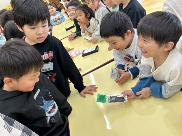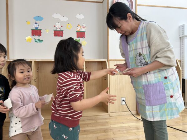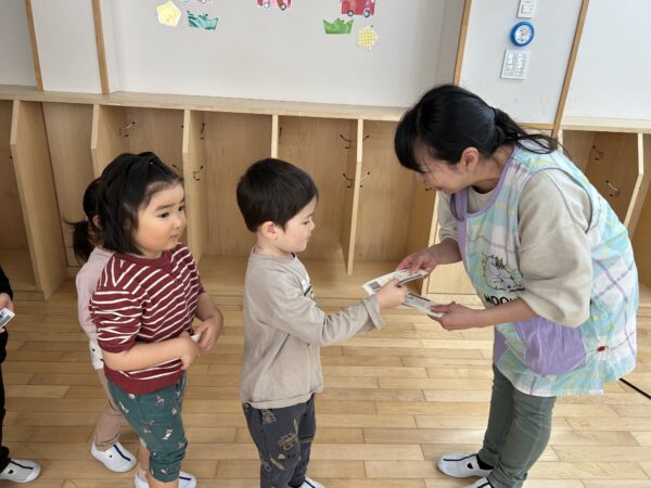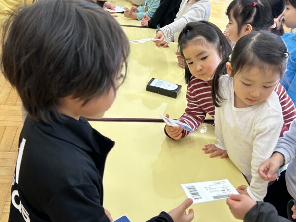 年長さんがクレジットカードを「ピッ」とすると、年少さんたちが「ペイペイ!」と言い、チケットを渡してくれます♪無事にチケットを買うことが出来た年長さんは、明日のお別れ会をとっても楽しみにしていました♡