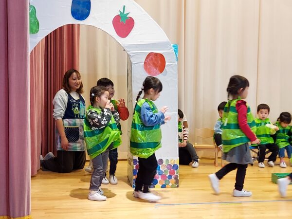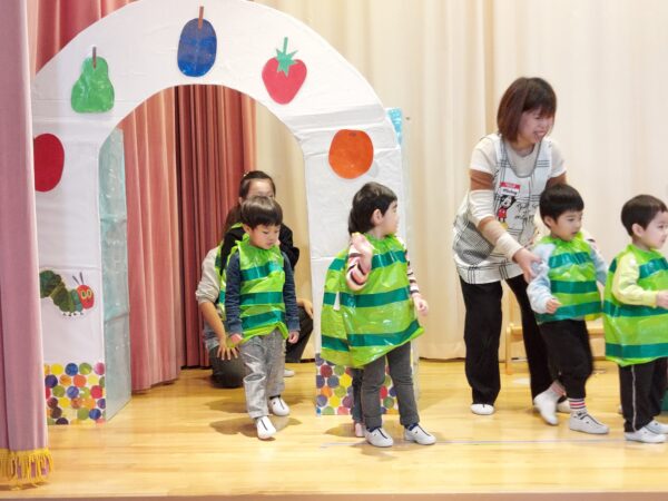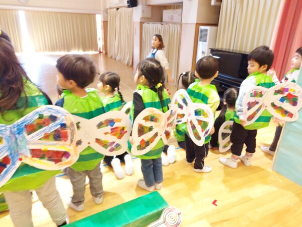 今日は、ホールでオペレッタの練習をしました☆衣装を着ての練習でした!トンネルをくぐったり、最後は素敵なちょうちょに変身したり・・・とっても可愛い子どもたちでした♪