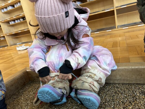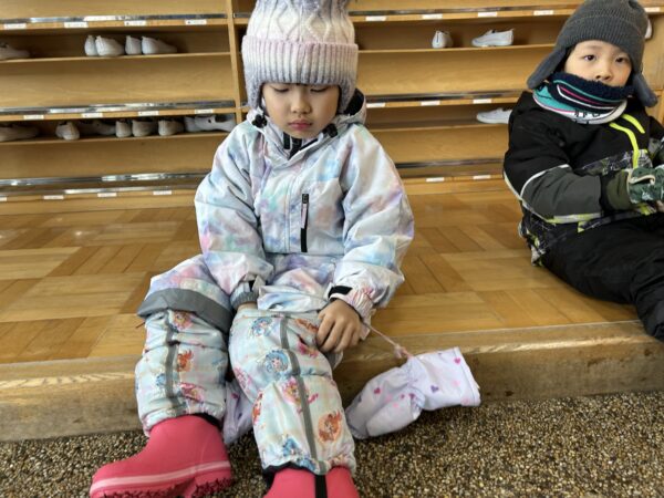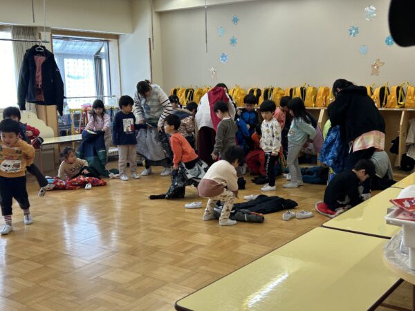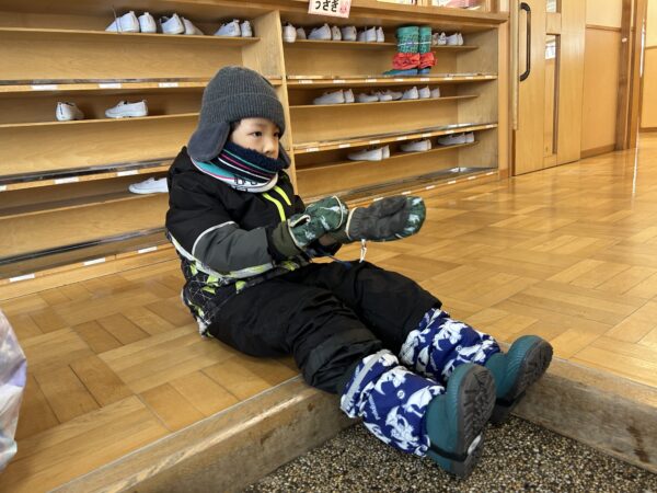 避難訓練の後は、全園児で雪遊びをしました☆手袋をはいたり、靴カバーをするのも、はじめは「先生やって~!」と言っていたお友だちもたくさんいましたが、少しずつ自分で挑戦するお友だちが増えてきましたよ♬