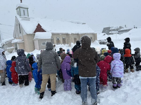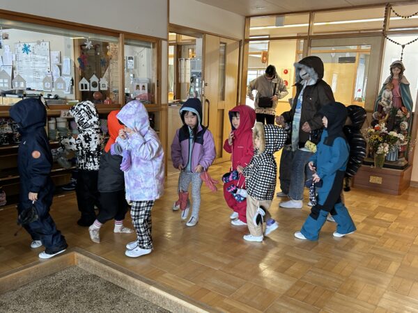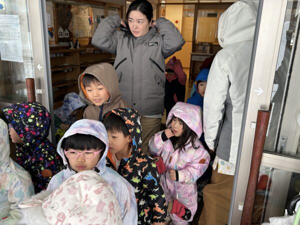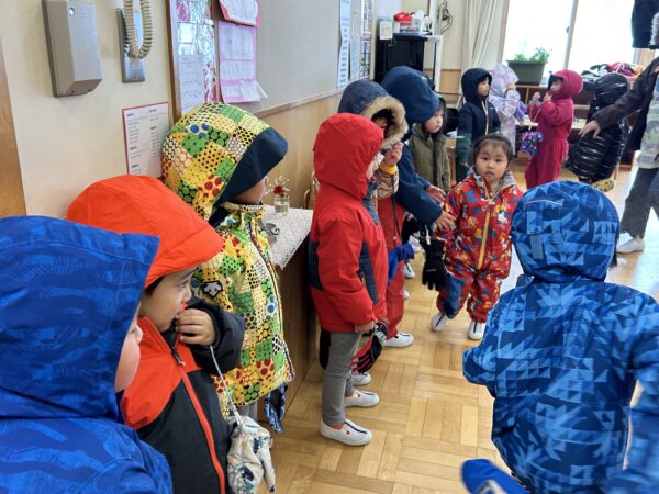 朝の会が終わると、地震を想定した避難訓練が行われました。冬の避難訓練ということで、ジャンパーを着て、グラウンドへ避難しました。頭を守るためにフードを被ったり、足を守るために靴を履いたり、どのクラスのお友だちも先生のお話しをしっかりと聞き、安全に落ち着いて避難することが出来ましたよ。